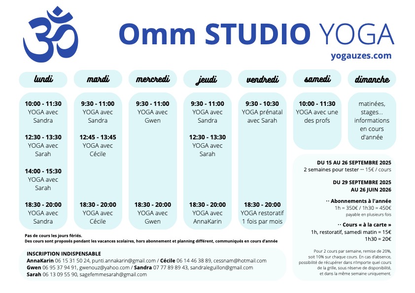 Vous pouvez arriver 10-15 minutes avant pour vous installer tranquillement. Les cours commencent à l’heure et finissent à l’heure. Si vous n’êtes pas abonnés, il faut impérativement contacter avant la prof pour être sur qu’il reste de la place.